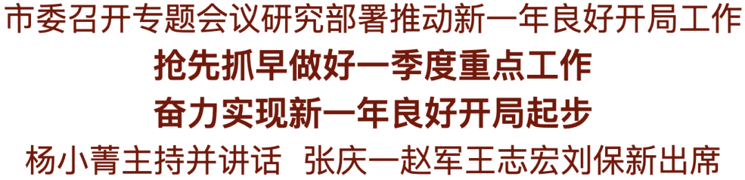 1月31日,市委召开专题会议,传达贯彻全省推动新一年良好开局动员部署会精神,动员全市上下以“人一之、我十之”的进取心和“一日无为、三日不安”的紧迫感,坚决打好冬春季攻保战役,全力以赴做好一季度各项工作,确保新一年开好局、起好步。市委书记杨小菁主持会议并讲话,市长张庆一传达全省会议精神,市委副书记赵军、市人大常委会主任王志宏、市政协主席刘保新出席。